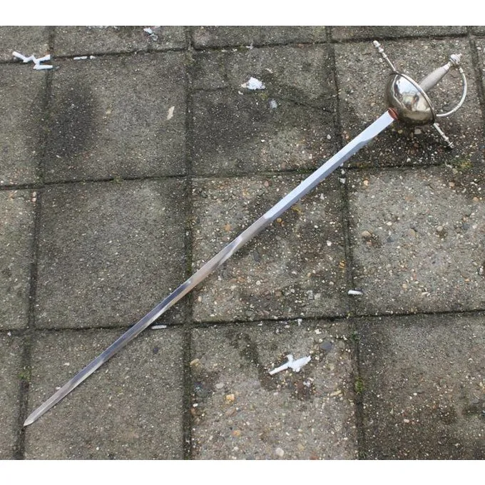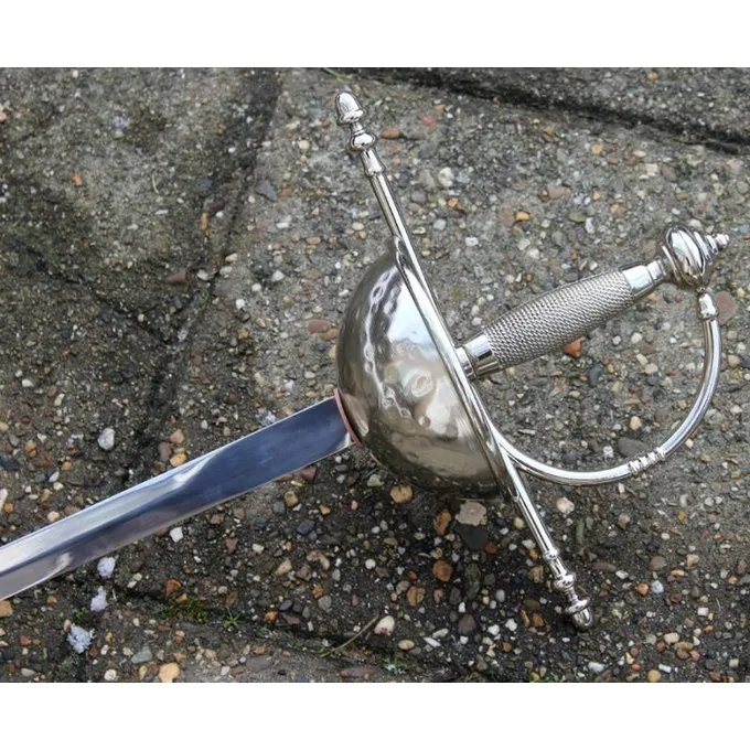 Das Rapier hat eine flexible Klinge aus Edelstahl. Seine Länge beträgt 106 cm und sein Name ist von seinem markanten Handschutz abgeleitet.