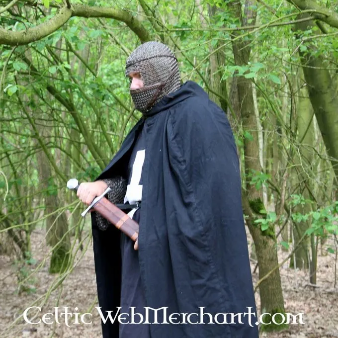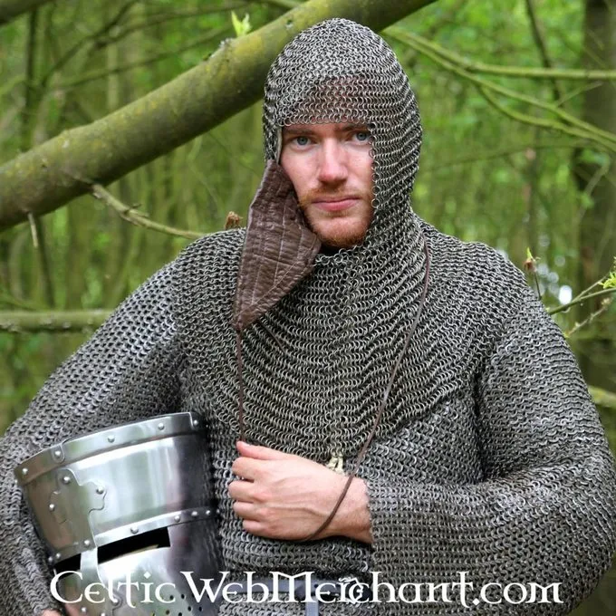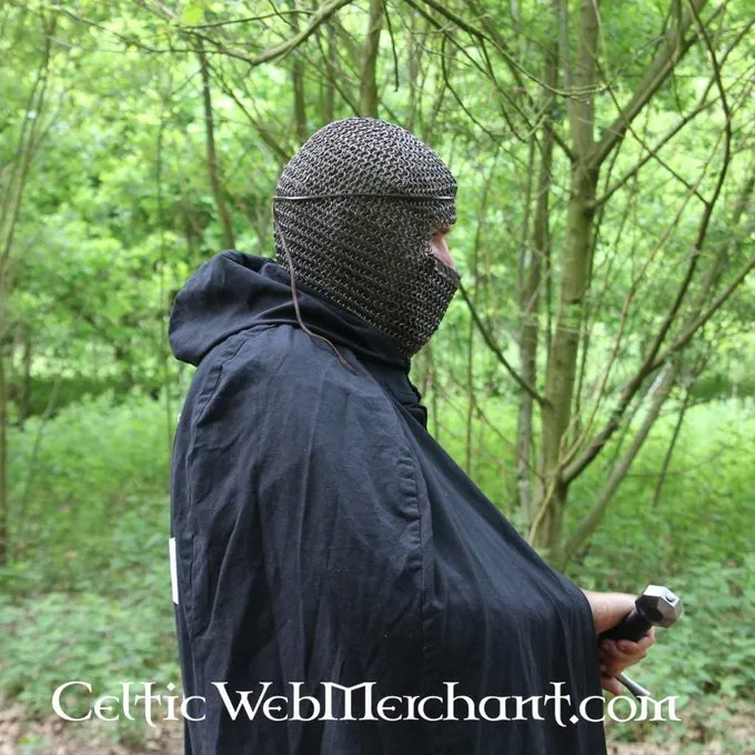 Diese Kettenhaube besteht aus 1,6 mm starken Weichstahlringen mit einem Innendurchmesser von 8 mm hergestellt. Es wird 4 in 1 aus geschwärztem Ring gewebt. Die Haube deckt die Schultern und hat ein dreieckiges Visier, das das Kinn, Mund und Nase schützt. Das Visier ist mit Leder auf der Innenseite bedeckt. Ungefähres Gewicht. 3,3 kg