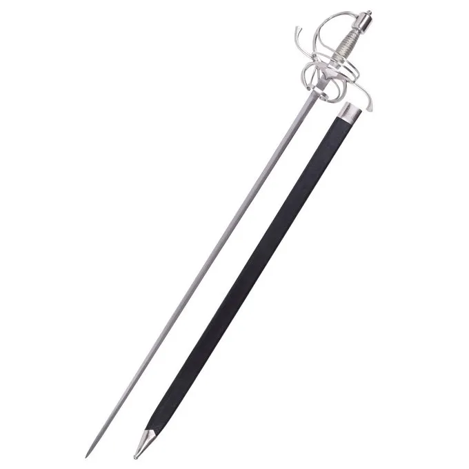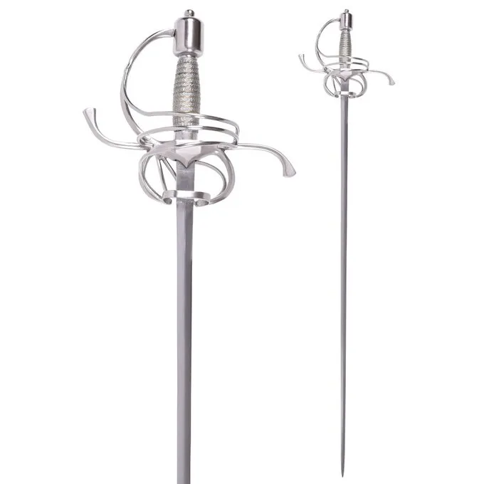Die Rapier kam zum ersten Mal in Gebrauch um 1500 und bis zum Ende des siebzehnten Jahrhunderts war dies die wichtigste Waffe der europäischen Bürger und Adel. Edlen Soldaten verwendet, um das Rapier in erster Linie für die Kriegsführung (es war perfekt für zwischen Platte Rüstung und Lederrüstung stechend), sondern auch für Zwecke wie Prunk Paraden. Eine Greiferwebmaschine wurde auch für Zäune und Duelle zwischen zwei Herren verwendet, so dass der Greifer ein permanentes Attribut eines Herren wurde. Diese Replik basiert auf verschiedenen deutschen Greifern aus dem siebzehnten Jahrhundert.
