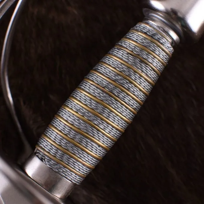 Die Klinge ist aus Federstahl EN45 mit verschraubtem pommel hergestellt. Es hat Griff mit einer S-förmigen Wache gefegt und einem Griff, der mit Stahldraht und Messingdraht verziert ist. Der Greifer ist mit einem schwarzen Lederscheide geliefert mit Holzkern und Stahl Chapes.