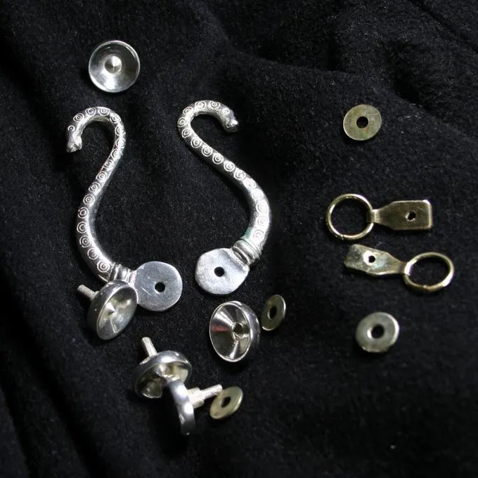 Dieses 14-teilige Set besteht aus Haken und Knöpfe für die lorica hamata. Die Haken sind aus nach einem Original in einem gallo-römischen Grab in Frankreich von 50 BC-50 AD gefunden.