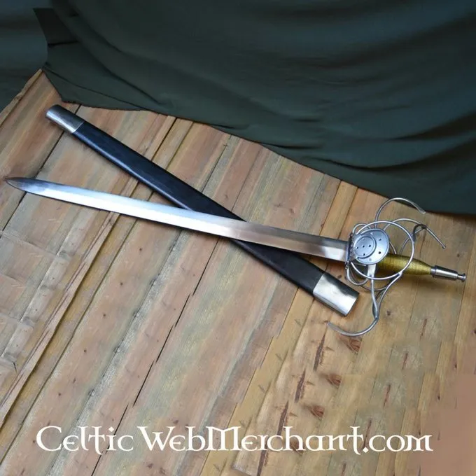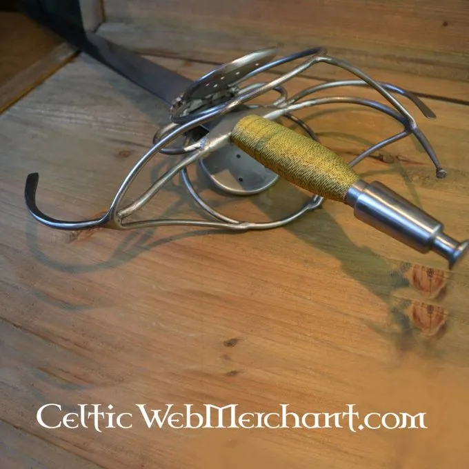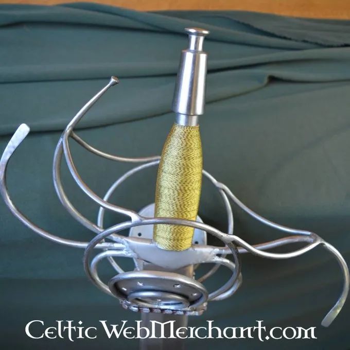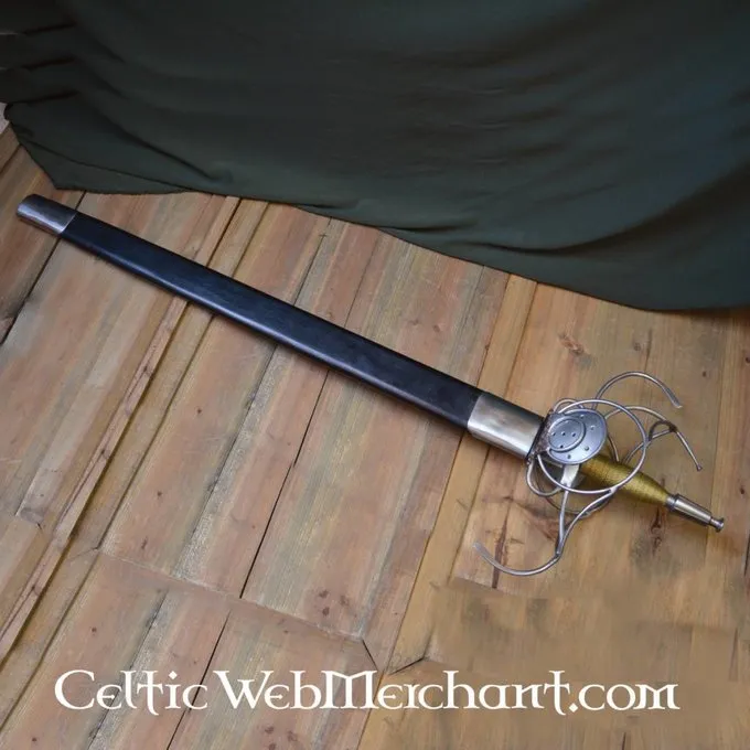 Dies ist eine Replik eines deutschen Pappenheimer Rapier. Dieser Rapier wird mit einer Scheide aus Holz mit Leder bezogen geliefert. Seine Länge beträgt 103 cm, hat es eine Klinge mit einer Länge von 80 cm und die maximale Breite 4,3 cm. Gewicht ohne Scheide: 1,9 kg