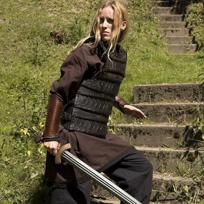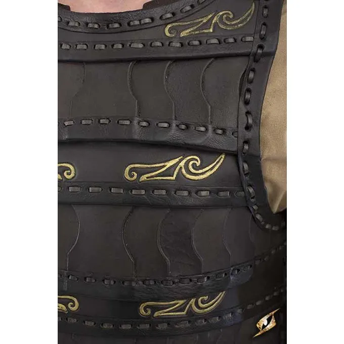 Schöne schwarze Leder Lamellenpanzer. Die Rüstung ist auf Vorlagen basieren, die von den Wikingern in der Antike und im frühen Mittelalter getragen wurden. Es ist mit Messing Dekoration, Ziernähte und Nähte fertig. Es kann mit Schnallen und Riemen auf die richtige Größe eingestellt werden. Geeignet sowohl für LARP und Reenactment. Die Rüstung ist in den Größen S / M und L / XL