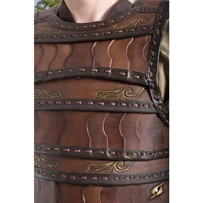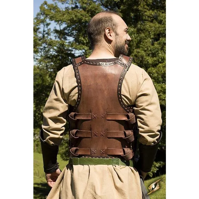 Schöne braune Leder Lamellen Rüstung. Die Rüstung ist auf Vorlagen basieren, die von den Wikingern in der Antike und im frühen Mittelalter getragen wurden. Es ist mit Messing Dekoration, Ziernähte und Nähte fertig. Es kann mit Schnallen und Riemen auf die richtige Größe eingestellt werden. Geeignet sowohl für LARP und Reenactment. Die Rüstung ist in den Größen S / M und L / XL