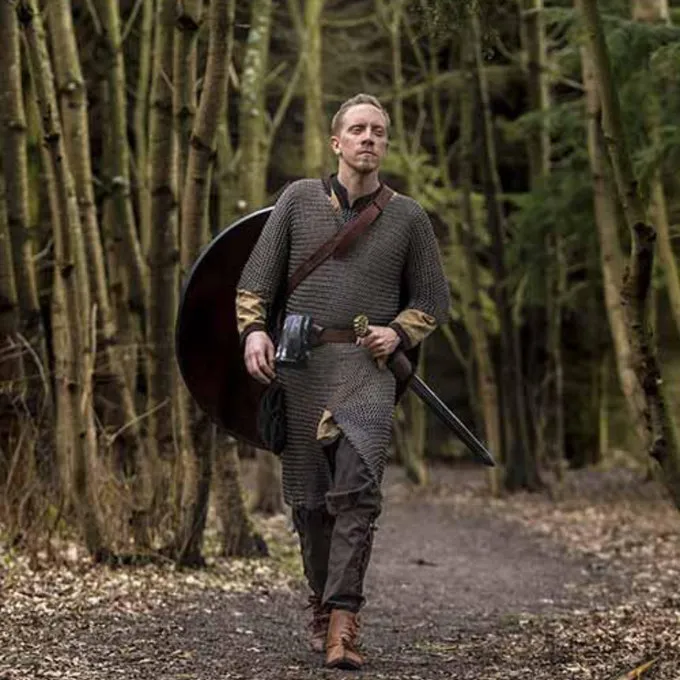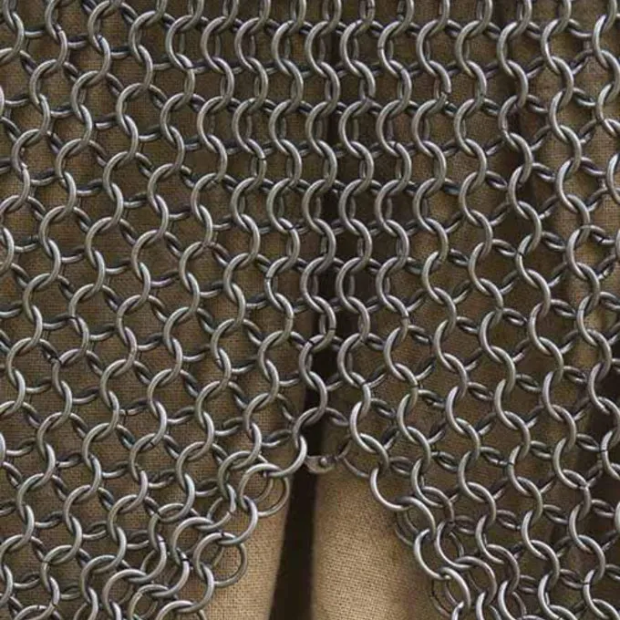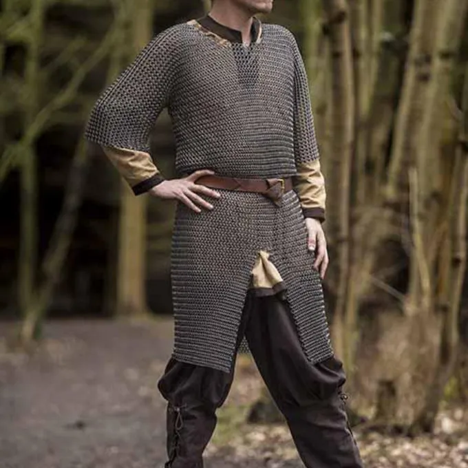 Diese Art von Kettenhemden wurde oft im Mittelalter verwendet. Die Teilung erleichtert die Handhabung beim Reiten und erleichtert die Bewegung ein wenig. Das Kettenhemd hat halblange Ärmel und ist aus Weichstahl.