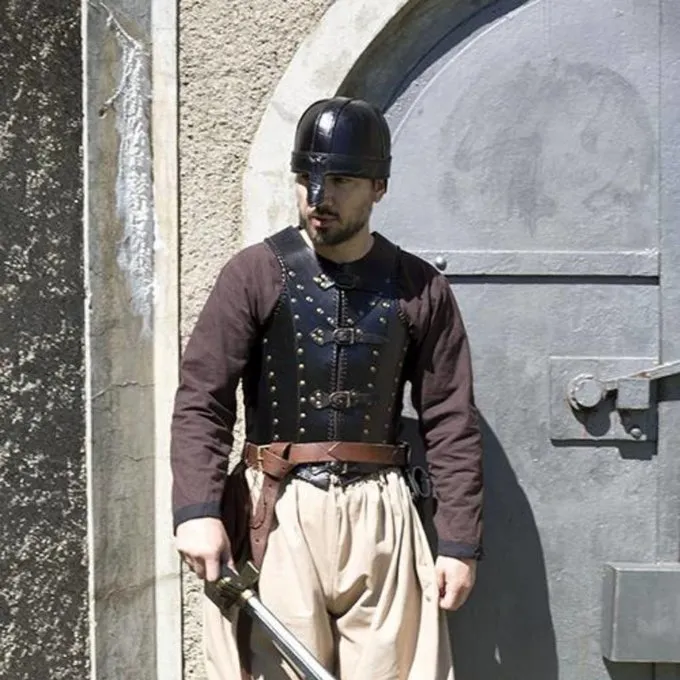 Diese LARP Rüstung besteht aus einem hochwertigen pflanzlich gegerbten Leder gefertigt und mit Messing Nieten verziert, im Stil des historischen brigandine. Die Rüstung wird durch die Lederausstattung von Soldaten aus dem vierzehnten bis zum sechzehnten Jahrhundert inspiriert. Diese Rüstung ist geeignet für historisches LARP, kann aber auch für Game of Thrones Cosplay und viele andere LARP und Cosplay-Einstellungen getragen werden.