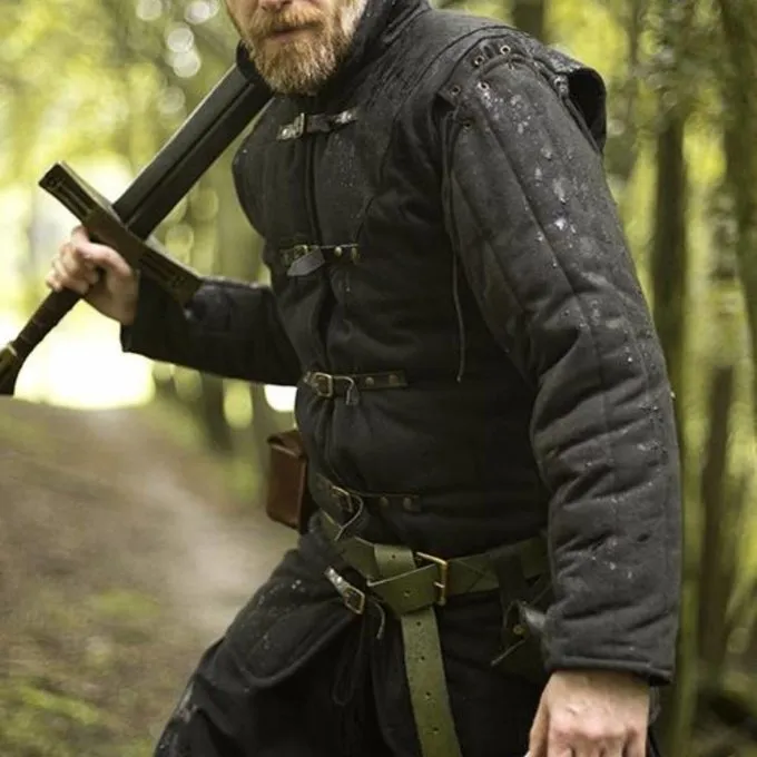 Dieser Gambeson bietet Schutz in Reenactment und LARP. Die Gambeson hat abnehmbare Ärmel und Sie können es mit Lederriemen schließen. Es reicht bis zu den Hüften. Die Gambeson besteht aus Schichten aus Baumwoll-Leinwand mit Polyesterwatte, in vertikalen Linien im europäischen Stil Mittel vernäht. Der Gambeson hat einen nach oben gerichteten Kragen. Sie können es in Kombination mit einem gepolsterten Kragen und Bundhaube für einen optimalen Schutz des Kopfes und des Halses tragen. Dieser Gambeson ist auch in größeren Größen erhältlich.