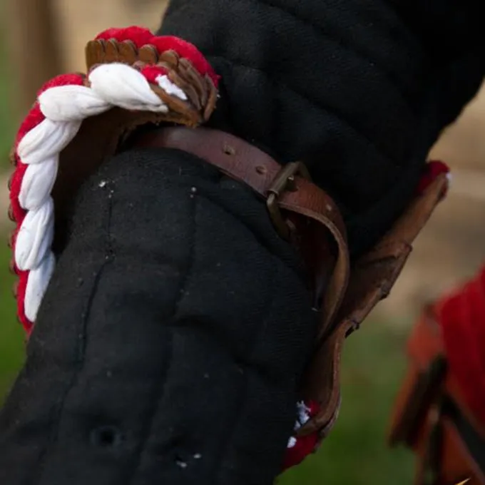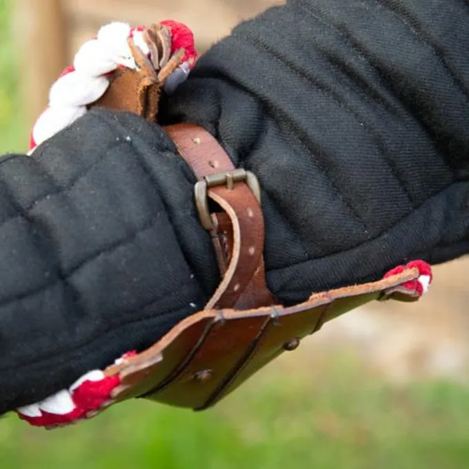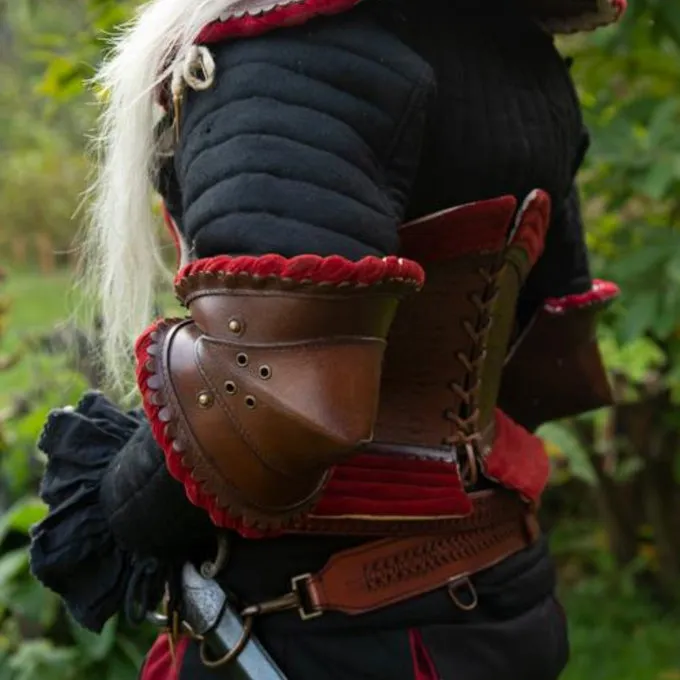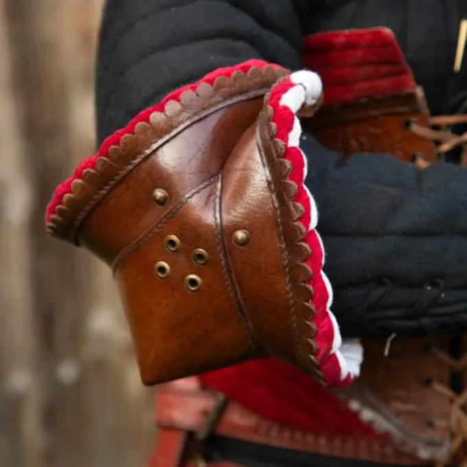 Diese schöne Lederrüstung schützt die Ellenbogen beim Kampf. Die couters werden paarweise geliefert und haben ein schönes Design, aus starkem braunem Leder mit einem dekorativen Muster an den Seiten. Sie sind auch mit Messingnägeln verziert. Die couters haben einen schönen Luxus-roten Samt gefüttert. Mit einem stabilen Ledergürtel können Sie die couters an der Innenseite des Ellbogens befestigen. Das Zentrum des couter hat vier Augen, um sie noch mehr mit zu Ihrem gambeson oder Wams Lederriemen sicher zu befestigen.