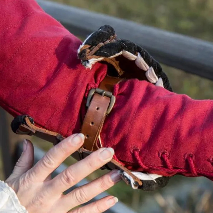 Diese schöne Lederrüstung schützt die Ellenbogen beim Kampf. Die couters werden paarweise geliefert und haben ein schönes Design, aus starkem braunem Leder mit einem dekorativen Muster an den Seiten. Sie sind auch mit Messingnägeln verziert. Die couters haben einen schönen Luxus schwarzem Samt gefüttert. Mit einem stabilen Ledergürtel können Sie die couters an der Innenseite des Ellbogens befestigen. Das Zentrum des couter hat vier Augen, um sie noch mehr mit zu Ihrem gambeson oder Wams Lederriemen sicher zu befestigen.
