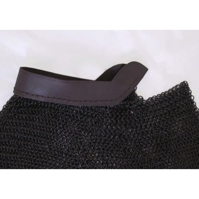 Dieses Kettenhemd Helmbrünne ist aus 1,6 mm dicken bronzed unvernietet Rundringen mit einem Innendurchmesser von 8 mm hergestellt. Es kann mit einer 4,5 cm breiten Lederband am Helm befestigt werden. Die Länge des Riemens beträgt 54 cm. Es wiegt ca.. 3,5 kg
