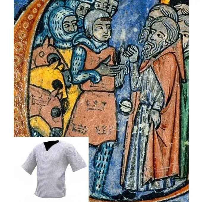 Dieses Kettenhemd ist aus 1,6 mm dicken verzinktem unvernietet Rundringen mit einem Innendurchmesser von 9 mm hergestellt. Die Ringe sind vier in einem handwoven. Das Kettenhemd mit kurzen Ärmeln und reicht bis zur Hüfte.