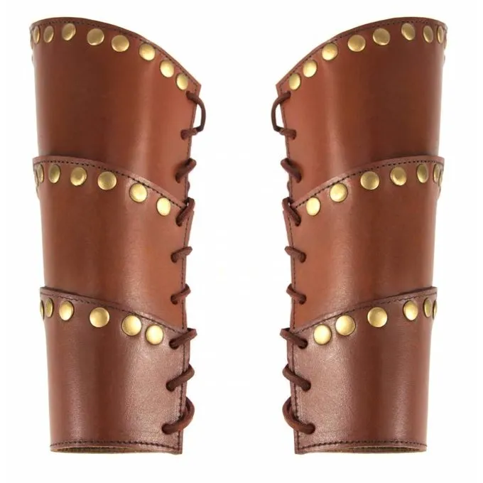 Dieses Paar Armschienen ist aus braunem Leder. Es ist mit Messing Nieten besetzt. Die Armschienen sind 24 cm hoch und 26 cm breit. Sie können mit Leder Schnürbänder auf Größe eingestellt werden.