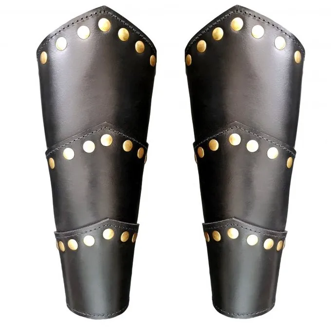 Dieses Paar Armschienen ist aus schwarzem Leder. Es ist mit Messing Nieten besetzt. Die Armschienen sind 24 cm hoch und 26 cm breit. Sie können mit Leder Schnürbänder auf Größe eingestellt werden.