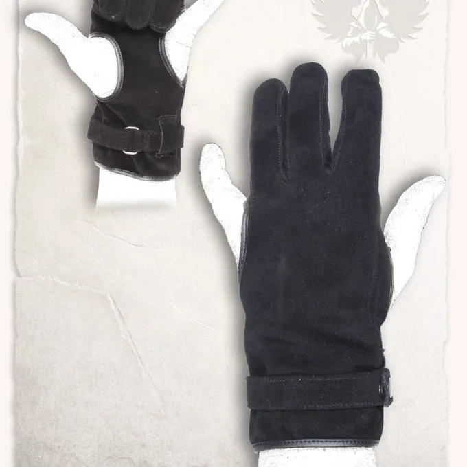 Material: Veloursleder / Farbe: Schwarz / Größe: S bis L / Lieferung: pro Stück / Geeignet für Bogenschießen / Erhältlich in der linken Hand und die rechte Hand Version / Auf einem historischen Original basiert