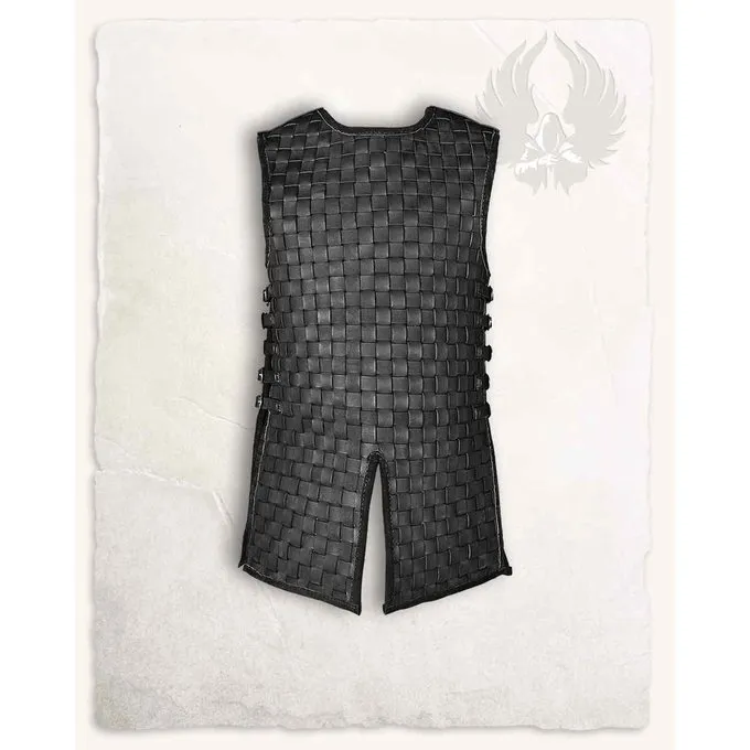 Diese Rüstung eignet sich für Nachstellungen, Cosplay und Larp. Dieses Produkt besteht aus oberen Leder. Die Rüstung besteht aus geflochtenen Lederstreifen. Auf jeder Seite der Rüstung befinden sich fünf Gürtelschnallen. Diese stellen sicher, dass die Anpassung optimal an die Anpassung seines Trägers angepasst werden kann. Da die Rüstung sowohl auf der Rückseite als auch auf der Vorderseite einen Schnitt hat, erhält der Träger zusätzliche Bewegungsfreiheit. Das Design selbst dieser Rüstung verleiht dem Träger einen authentischen und robusten Look.
