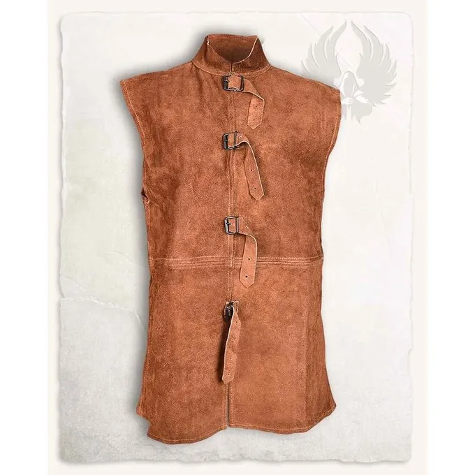 Die Orthell -Weste besteht aus weichem Wildleder. Es schließt vorne mit vier Rollenschnallen. Diese können auch verwendet werden, um die Weste individuell an die Größe des Trägers anzupassen. Um die Mobilität zu verbessern, hat es eine Spaltung auf der Rückseite. Orthello ist ein winddichtes und robustes äußeres Kleidungsstück, das viele Kombinationsoptionen bietet. Es kann mit Kapuzen und Kragen fertiggestellt werden und trägt sich gut unter einer Lederpanzerung über einem Kettenhemd. Mit dieser Weste als Grundlage können viele Kostüme realisiert werden. Perfekt für ein LARP -Versammlung oder ein mittelalterliches Festival.