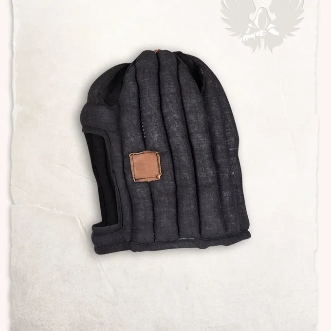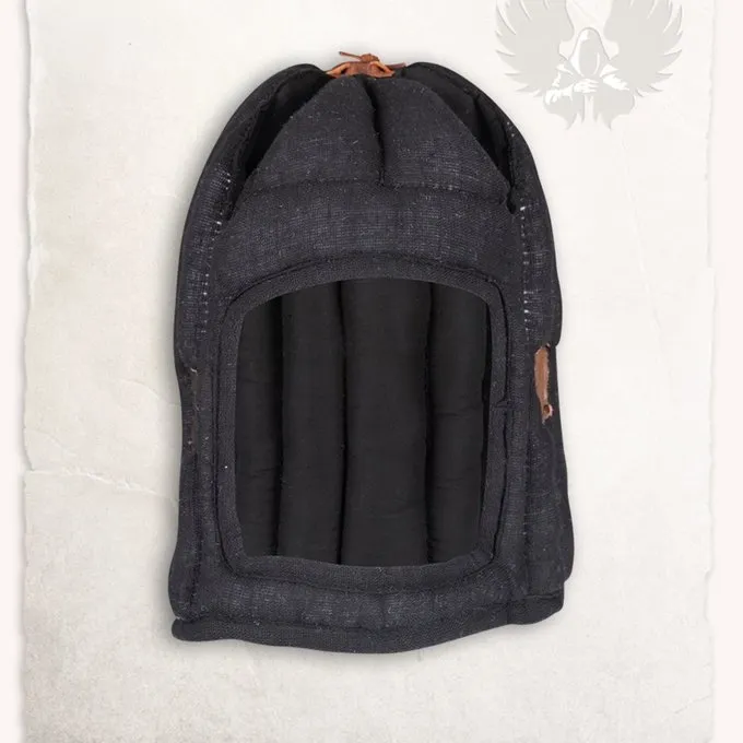 Diese Bewaffnung Kappe ist auf einen aus dem 15. Jahrhundert Original basiert, die heute Teil der Sammlung in der Hofjagd ist und Rüstkammer in Wien. Die Bewaffnung Kappe schützt den ganzen Kopf und hat Lederverstärkungen an den Ohren. Die Oberseite ist mit einem Lederband geschlossen, so kann es auf eine Größe eingestellt werden. Diese Bewaffnung Kappe ist aus groben woven Leinen- und Baumwollmischung mit einem Wollfilz Polsterung. Diese Bewaffnung Kappe kann unter dem bascinet, großer Helm getragen wird, Eimer Helm, armet und unter einigen Arten von sallets.