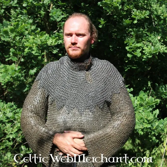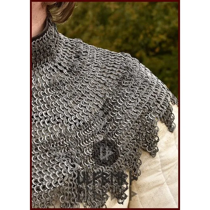 Helmbrünnen wie diese wurden in ganz Europa im 15. und 16. Jahrhundert getragen. Im 16. Jahrhundert war es sehr beliebt unter dem deutschen Landsknecht und der schottischen und irischen Galloglass. Diese Art von Helmbrünne ist auch Bischofsmantel genannt. Es hat Lederriemen mit Replik Schnallen. Die untere Seite des Kragens ist aus Messing gefertigt Ketten. Diese Helmbrünne ist aus gemischten Nieted Flachringe Rundnieten 1: 4.