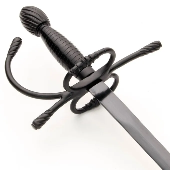 Eine schöne Rapier von Windlass Steelcrafts basierend auf historische Schwerter aus dem 17. Jahrhundert, aber mit einem Fantasy-Twist. Dieser Rapier wurde von den Piraten Rapieren inspiriert, die von Piraten segeln die sieben Meere verwendet wurden. Der schwarze Griff des Rapier aus verdrehtem Stahl, erinnert an dem Seil, dass ein Pirat ein Schiff zu überfallen verwendet. Dieses Schwert wird mit einer schwarzen Scheide mit Totenkopf geliefert. Die halb scharfe Klinge wird mit einer Härte von 48-52 HRC aus gehärtetem 1065 Kohlenstoffstahl geschmiedet. Ein großes Zierschwert für die Wand, auch schön für einen Piraten Cosplay Kostüm von Serien und Filmen wie Black Sails und Fluch der Karibik. Wenn Sie die Klinge blunten, ist es ein großer Kampf Schwert für Schwertkampf.